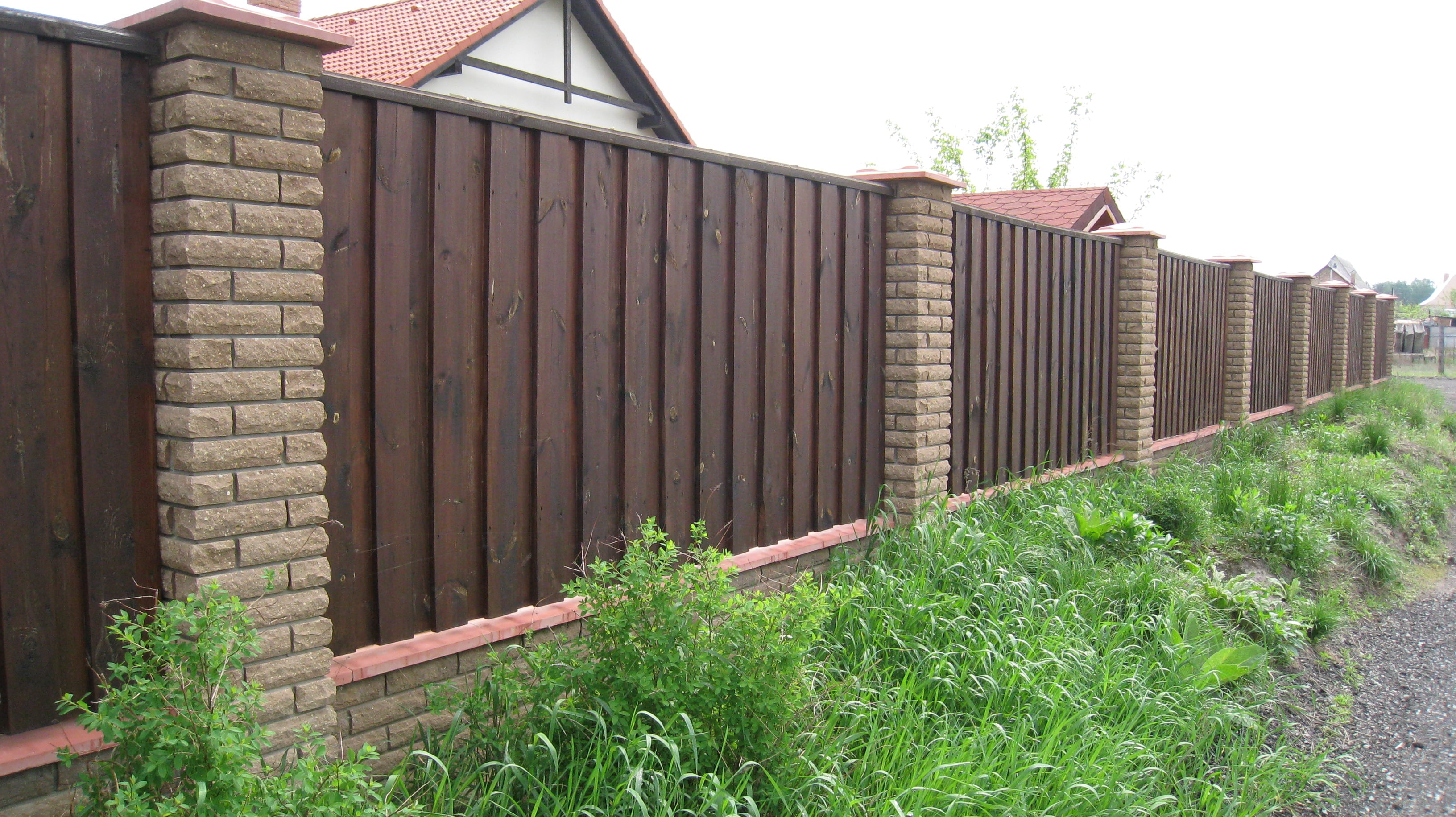 - Заборы из дерева могут иметь вставки из металла, камня или кирпича. Дерево сочетается с любым материалом.